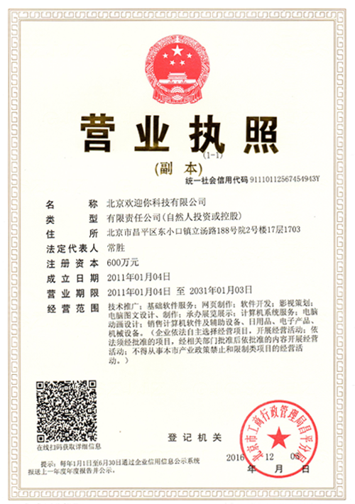 北京歡迎你科技有限公司獲得多項版權局"計算機軟件著作權登記證書",并已獲得“全國誠信經營示范單位”、“全國質量服務客戶滿意誠信企業”和“全國重合同守信用品牌企業”等榮譽稱號。